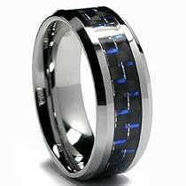 This beautiful tungsten carbide ring is 8MM in width and comfort fit. It is all high polish with beveled edges and has Black & Blue carbon fiber inlay. If you are looking for a ring that is scratch proof and forever keep its shine than our Tungsten Carbide rings are for you. Tungsten Carbide is ranked second hardest next to diamond on the Mohs scale diamond being a 10 followed by Tungsten Carbide as 9. All of our Tungsten rings are Cobalt Free and hypoallergenic. Our rings will not cause skin irritations or turn your fingers green. Due to the Hardness of Tungsten these rings can be laser engraved but not hand engraved. All ring come with a 100% Money Back Guarantee and a FREE leather ring Box.[]