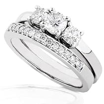 This beautiful bridal set comes with a three stone Diamond engagement ring of 1/4 carat weight and a Diamond band that holds a total of 14 round brilliant-cut Diamonds in a sparkling Pave-setting.[]